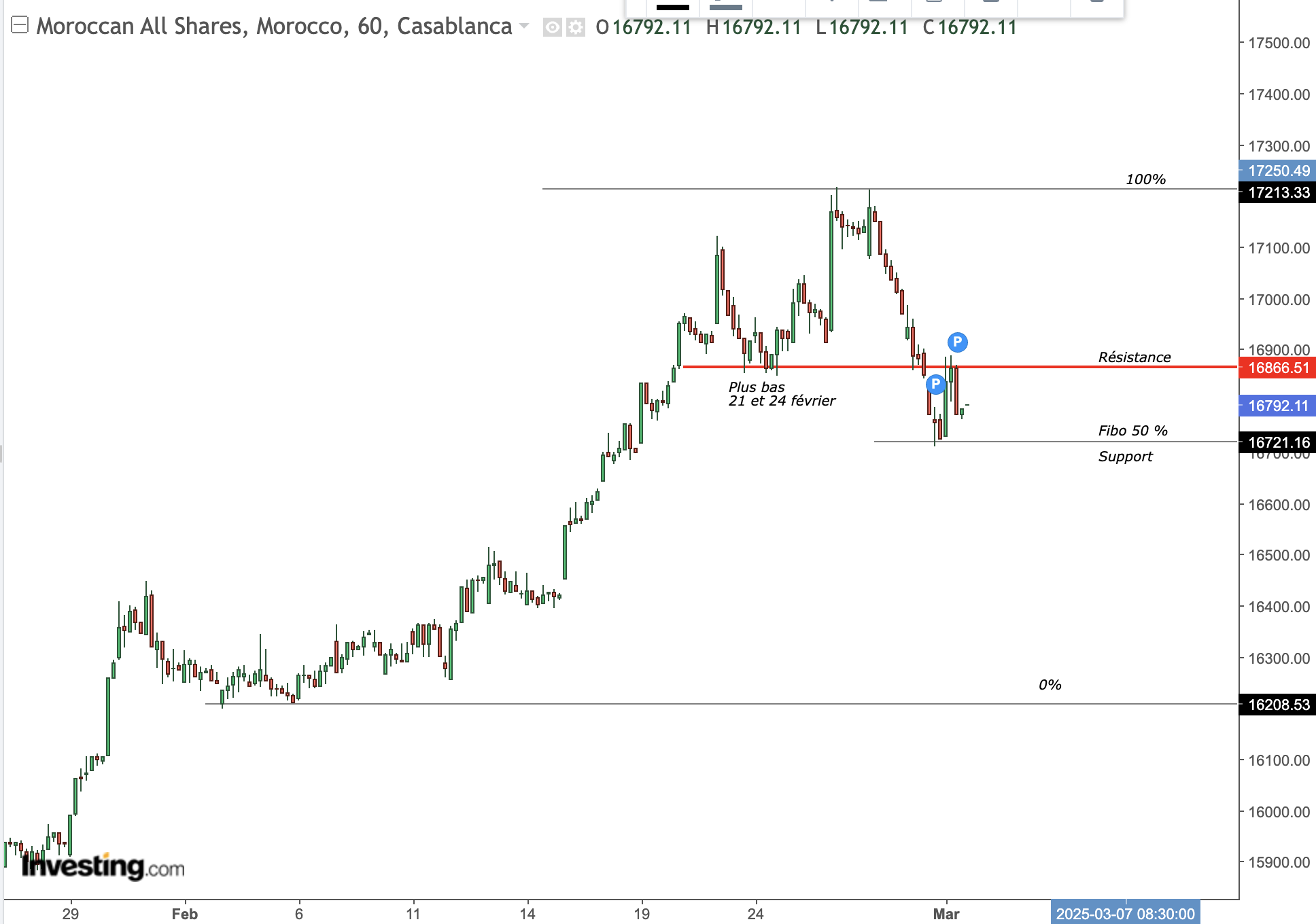 على المستوى البياني، مكّن التسارع الهبوطي من كسر الدعم قصير المدى الذي تشكل بين 21 و24 فبراير، كما هو موضح في الرسم البياني أدناه. وجد المؤشر أخيرًا الدعم عند مستوى التصحيح 50% من الموجة الصعودية الأخيرة.