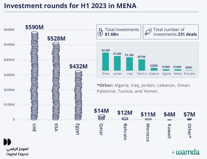 ووفقًا لبيانات "ومضة" أيضًا، تمكنت 45 مقاولة ناشئة في منطقة الشرق الأوسط وشمال أفريقيا من الحصول على تمويل في نهاية يونيو 2023 بمبلغ إجمالي قدره 35.6 مليون دولار، بما في ذلك مقاولتان في المغرب، بقيمة 150 ألف دولار. وتصدرت المملكة العربية السعودية بـ 25 مليون دولار من الاستثمارات التي جمعتها 20 مقاولة ناشئة، متبوعة بالإمارات (12 مقاولة ناشئة / 5 ملايين)، ومصر (5 مقاولات ناشئة / 4.8 ملايين).