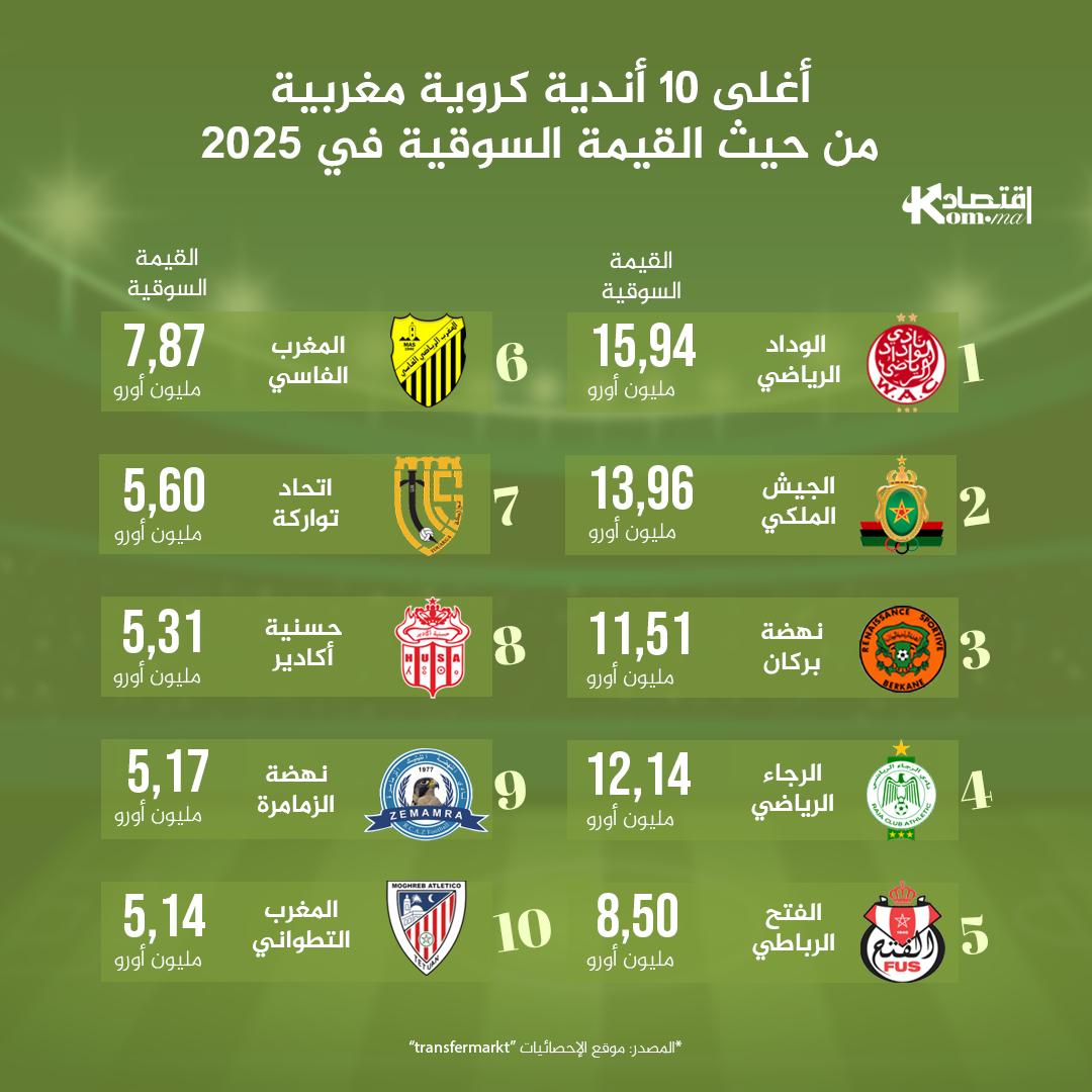 وتصل القيمة السوقية الإجمالية للبطولة برسم شهر يناير 2025 أزيد من 119 مليون أورو، حسب الموقع العالمي المتخصص في الإحصائيات الكروية transfermarkt.