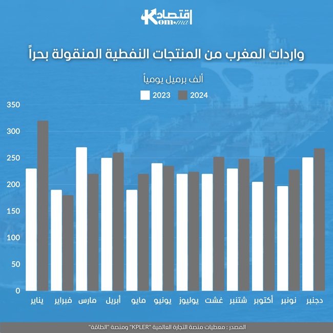 بلغ متوسط واردات المغرب من المنتجات النفطية في 2024 -المنقولة بحرًا- 242 ألف برميل يوميًا خلال 2024، مقابل 224 ألف برميل يوميًا في عام 2023.