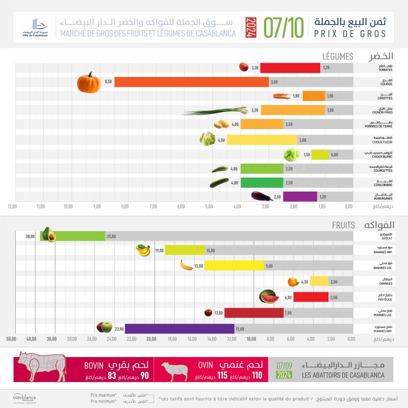 أما بالنسبة لأسعار الفواكه، فتراوح سعر "الموز المستورد" بين 15 دراهم و 19درهم للكيلوغرام، بينما بلغ سعر " التفاح المستورد"هذا الأسبوع ما بين 12 دراهم و23 دراهم للكيلوغرام، فيما تراوح سعر" بطيخ/ الدلاح "، ما بين 2.50 درهم و6 دارهم للكيلوغرام.