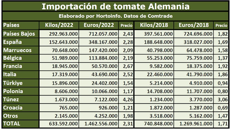 واستوردت ألمانيا خلال السنة الماضية، ما مجموعه 633.59 مليون كيلوغرام من الطماطم بقيمة 1462.56 مليون أورو، بمتوسط سعر 2.31 أورو للكيلوغرام الواحد.